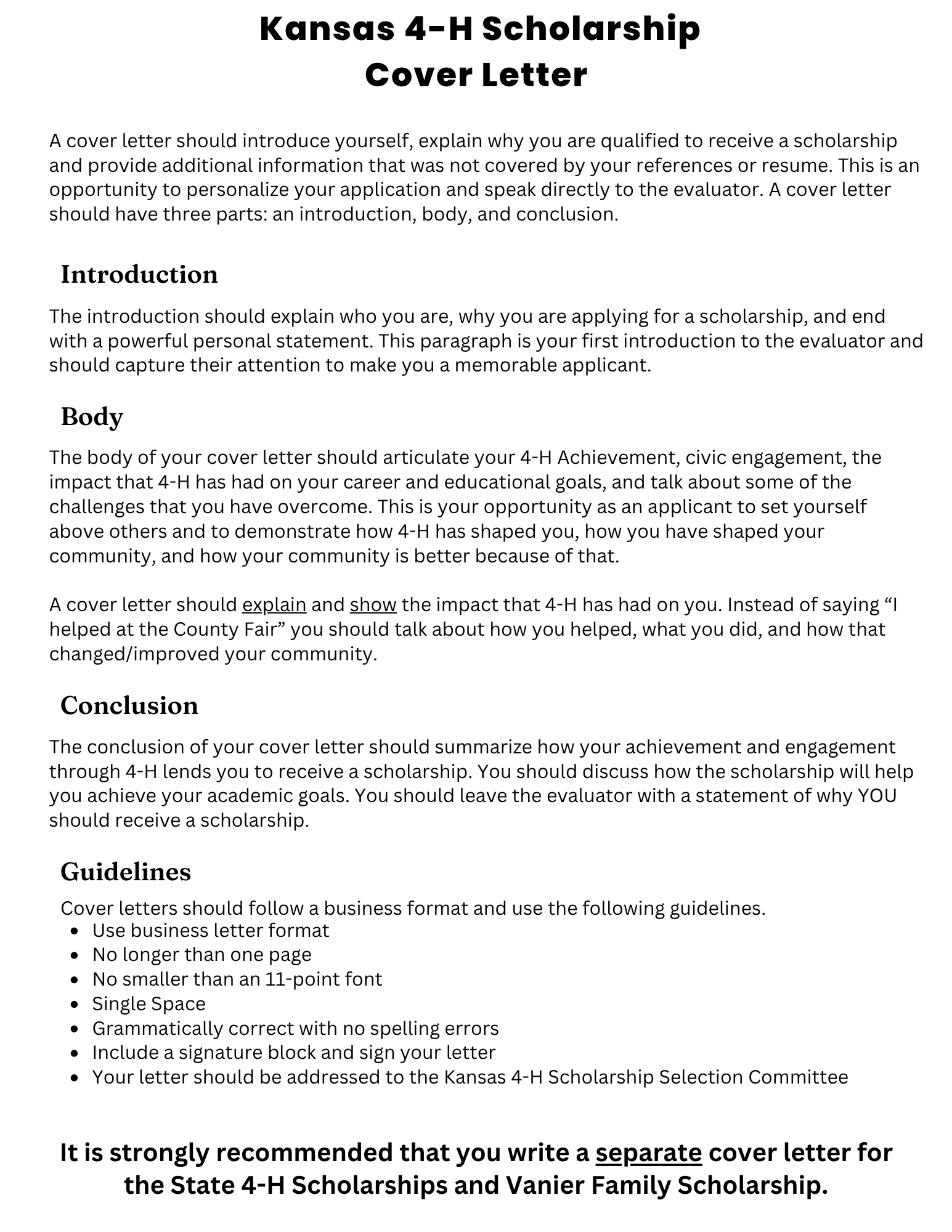 The Kansas 4-H Scholarship program is open to graduating high school seniors, current college students, and graduate students who have been part of the 4-H experience. Each scholarship has its own criteria, and you may qualify for several. You will only need to fill out one application to be considered for all available scholarships.