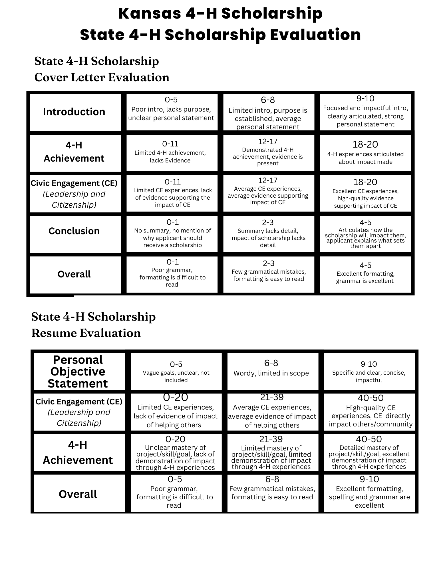 The Kansas 4-H Scholarship program is open to graduating high school seniors, current college students, and graduate students who have been part of the 4-H experience. Each scholarship has its own criteria, and you may qualify for several. You will only need to fill out one application to be considered for all available scholarships.
