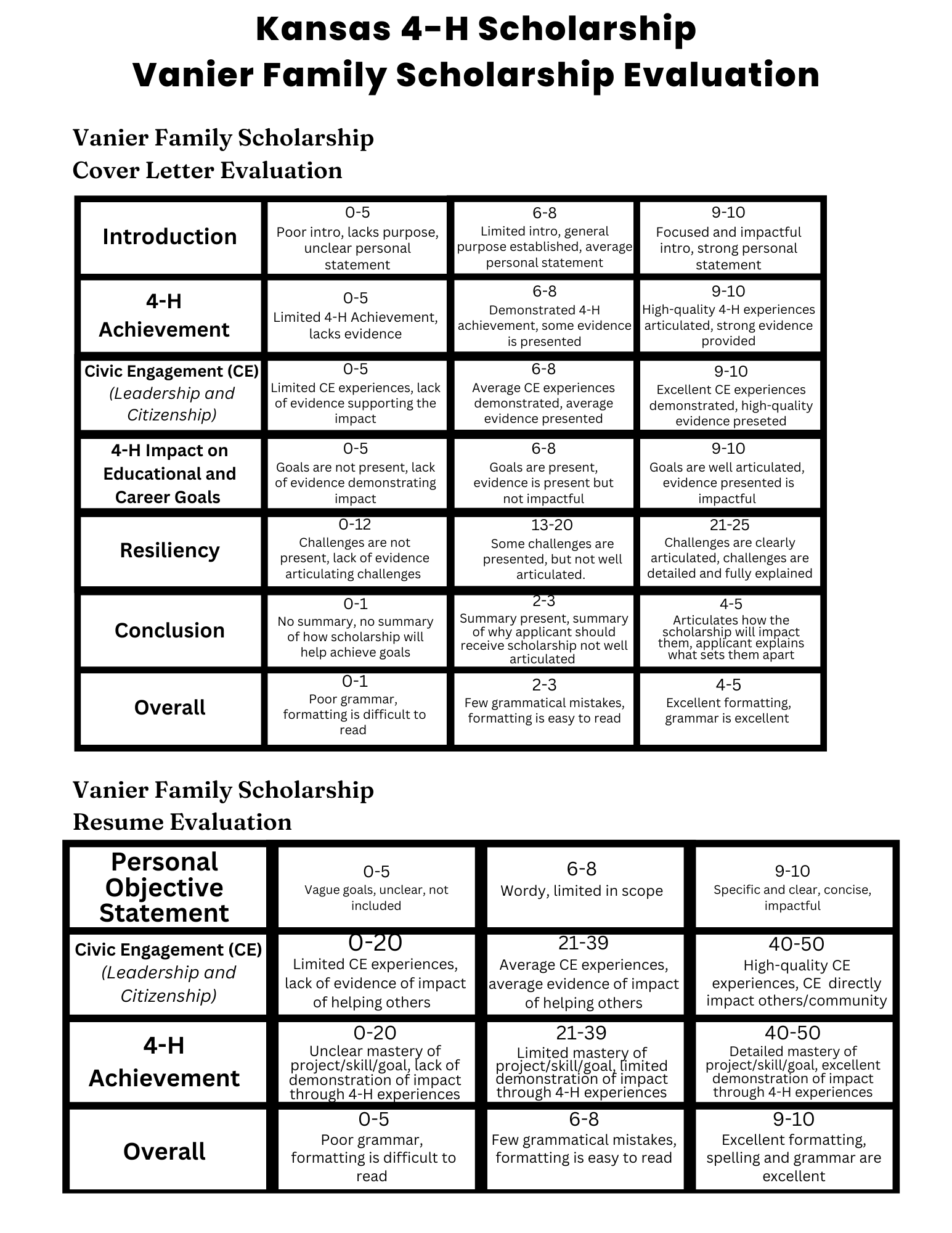 Once the evaluation of all of the scholarships has been completed, scores between all judges are first neutralized and then averaged. State 4-H Scholarship are put in order of highest score to lowest score and then matched with the different State 4-H Scholarships based on criteria needed and order of rank. The Vanier Family Scholarship Program applicants are ranked, and then based upon the amount available to award that year, applicants are asked to participate in an interview with another set of evaluators.
